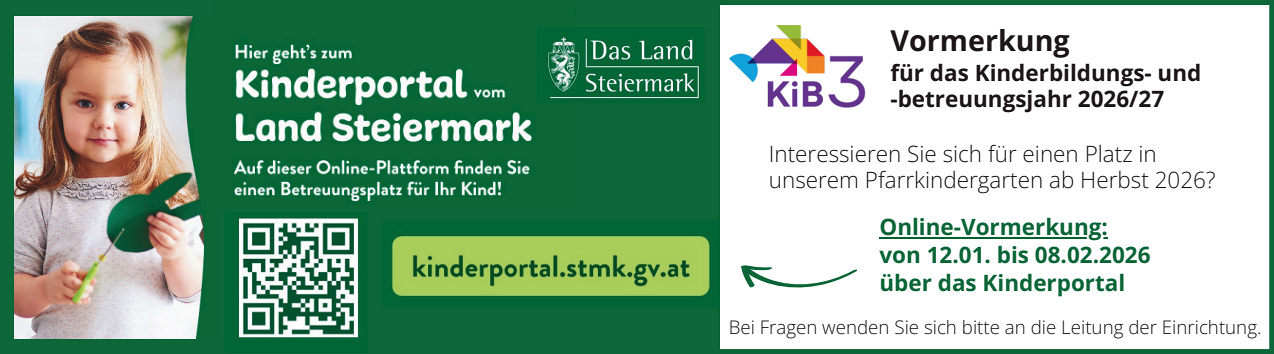 Unsere elementarpädagogische Einrichtung gehört zur Katholischen Kirche Steiermark und wird von der KiB³ - Kinder in Bildungs- und Betreuungseinrichtungen in der Diözese Graz-Seckau geführt. Erhalter ist unsere Pfarre.