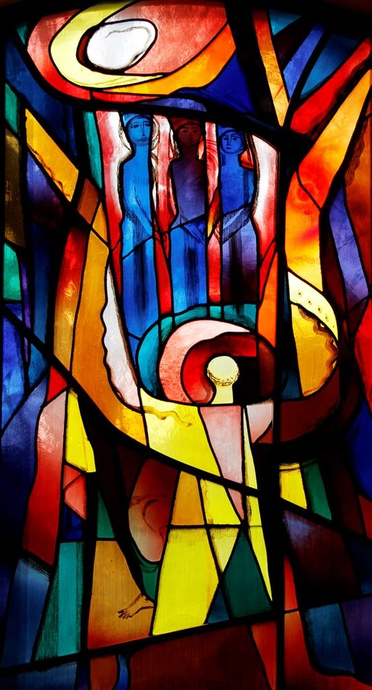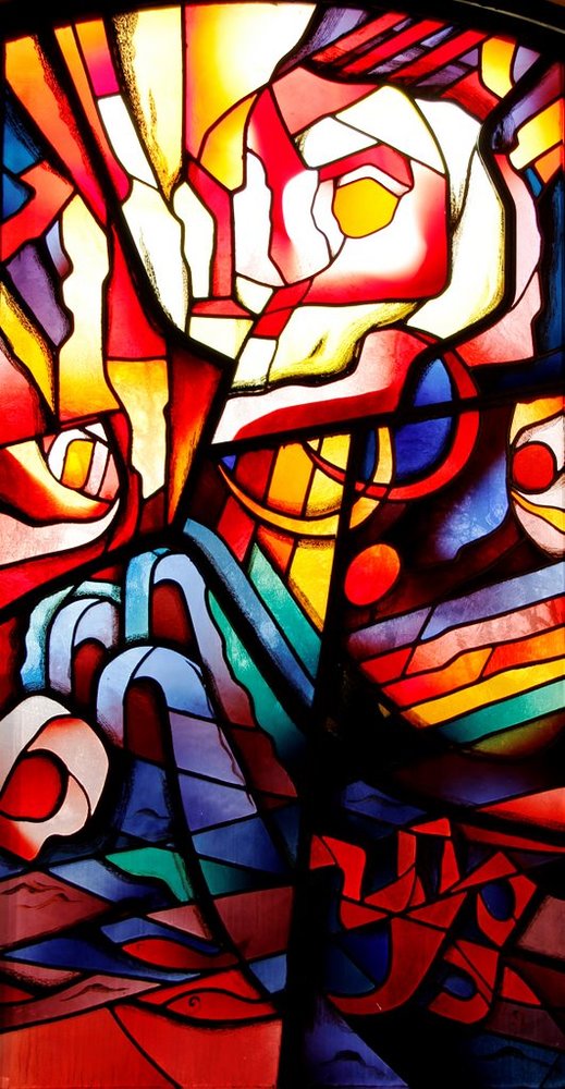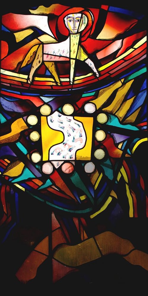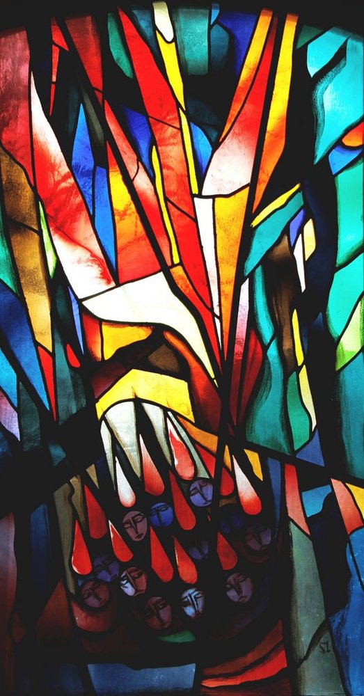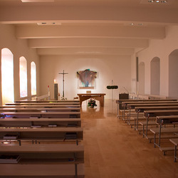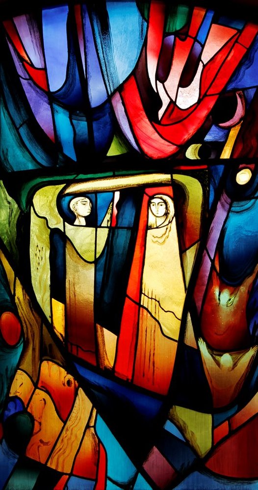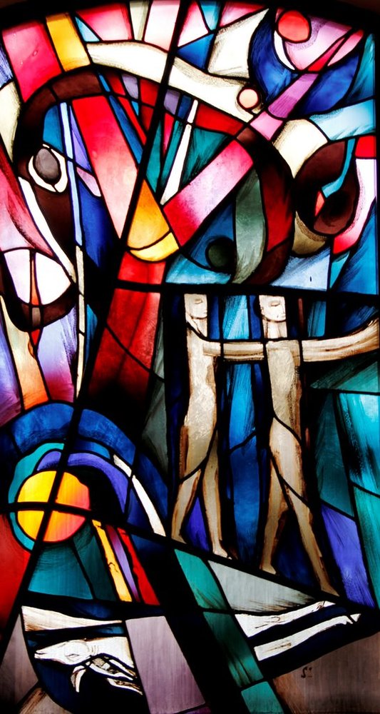 Das glühende Grün vom Bildhintergrund des Kreuzbildes wird fortgeführt in den ostseitigen Glasfenstern Michael Kienzers. Seine Glasskulpturen-Fenster erzählen nichts, stemmen sich gegen die hektische Bilderfülle unseres Medienzeitalters. In mehrere Schichten aus Glas hat Kienzer seine malerischen Gesten eingetragen, in Kommunikation untereinander, aber auch durchlässig für den Aussenraum, der mit lebensvollem Grün am Morgen prägend in den Innenraum tritt. Die Glaswand des Eingangsbereichs setzt den Dialog fort; Kapellenraum und Foyer werden zu spannender Zwiesprache geführt: Der Ort des Gebets und kontemplativer Ruhe existiert nicht abgehoben von unserer Lebenswelt, er wirkt hinaus und unser Alltag in ihn hinein.