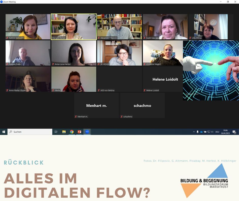 Dass eine solche Abschlussveranstaltung in hybrider Form feierlich begangen werden kann, bewiesen die Bildungsreferentin für Digitalisierung, Christine Magerl, MA (KBW), und die Leiterin des Bildungsforums Mariatrost, Dr.in Kathrin Karloff, eindrucksvoll mit einem abwechslungsreichen Programm von einer Schnitzeljagd, über Gruppenpräsentationen und einem Video-Zusammenschnitt sämtlicher Projektergebnisse bis hin zu einem Kurzvortrag von Mag. Karl Schneeberger, Leiter der Abteilung ‚Betriebs-betreuung/ ArbeitnehmerInnenschutz‘ der AK Steiermark und verantwortlich für den Projektfonds Arbeit 4.0.