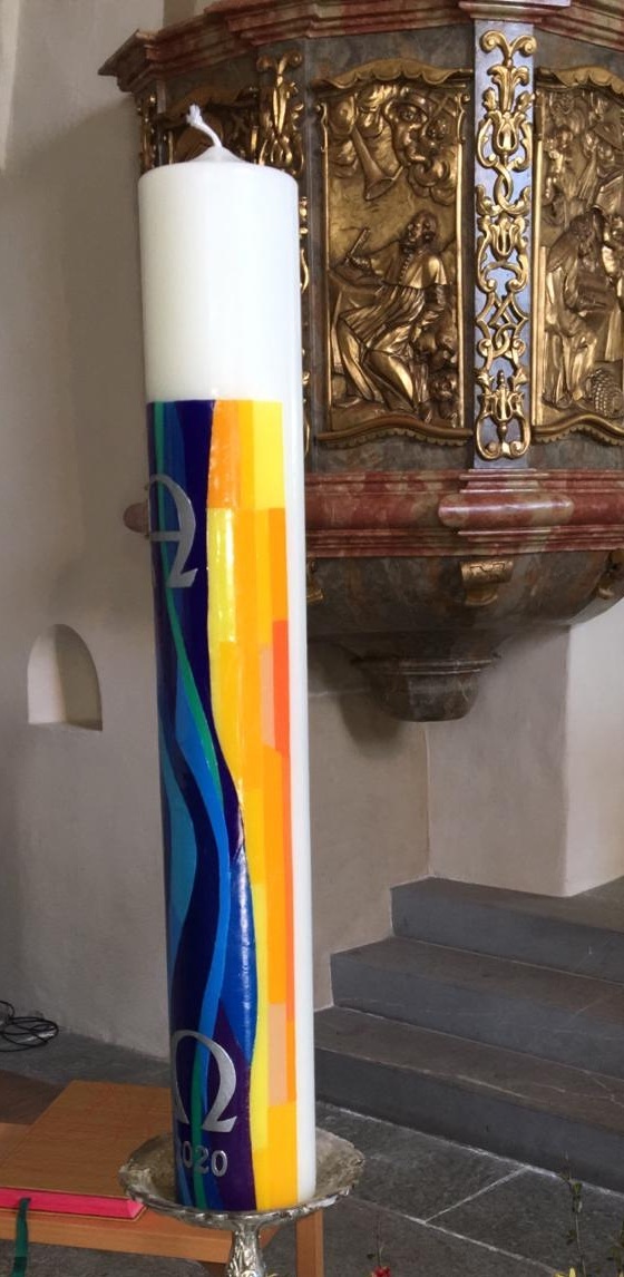 Die Osterkerze in unserer Pfarrkirche wurde – wie jedes Jahr – von Reingard und Claudia Glößl gestaltet. Norbert Glößl schreibt zur Symbolik der Osterkerze 2020: