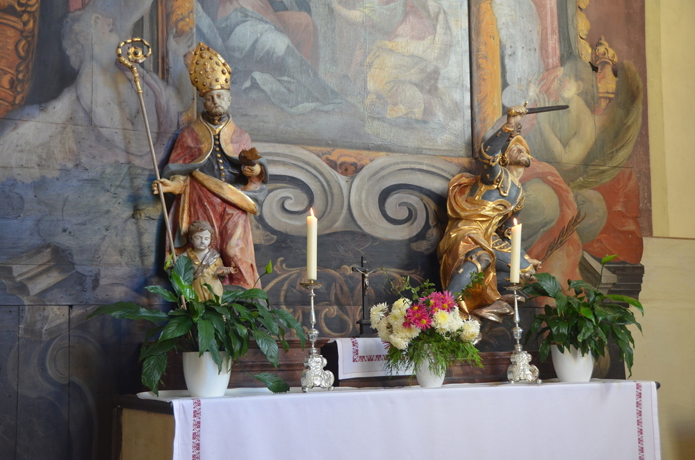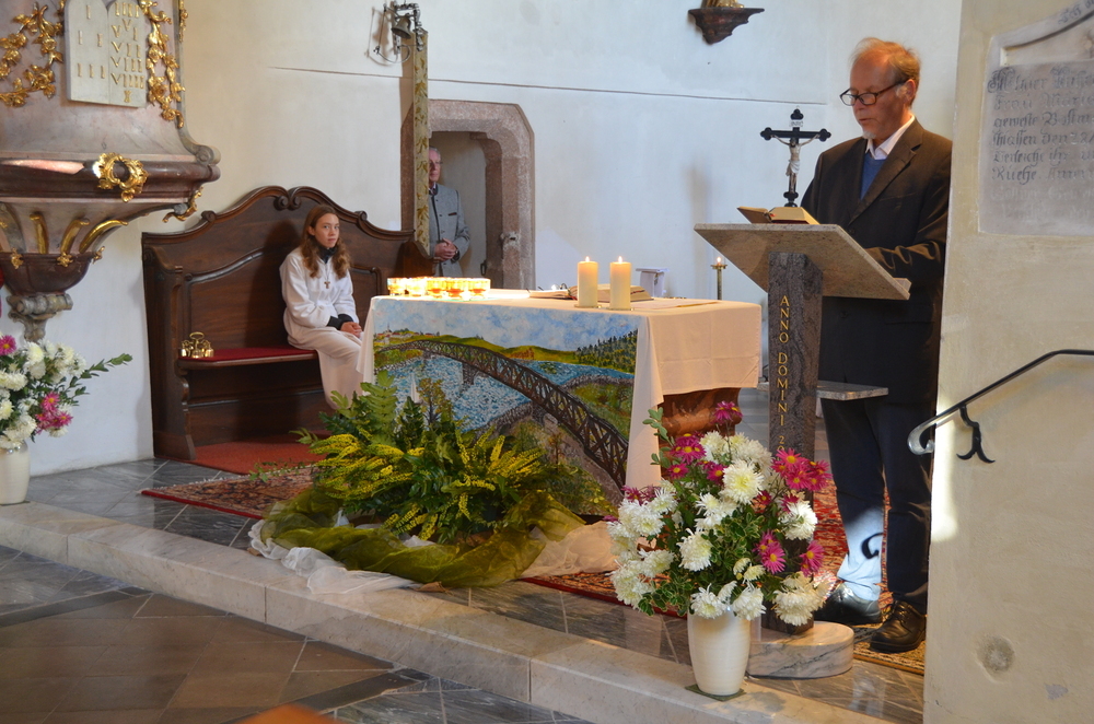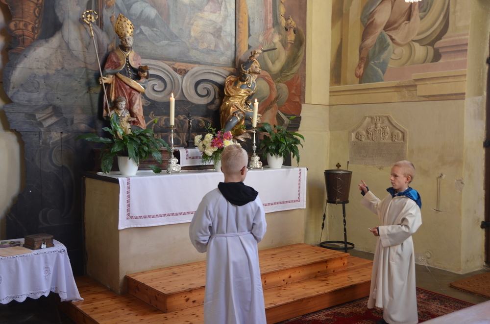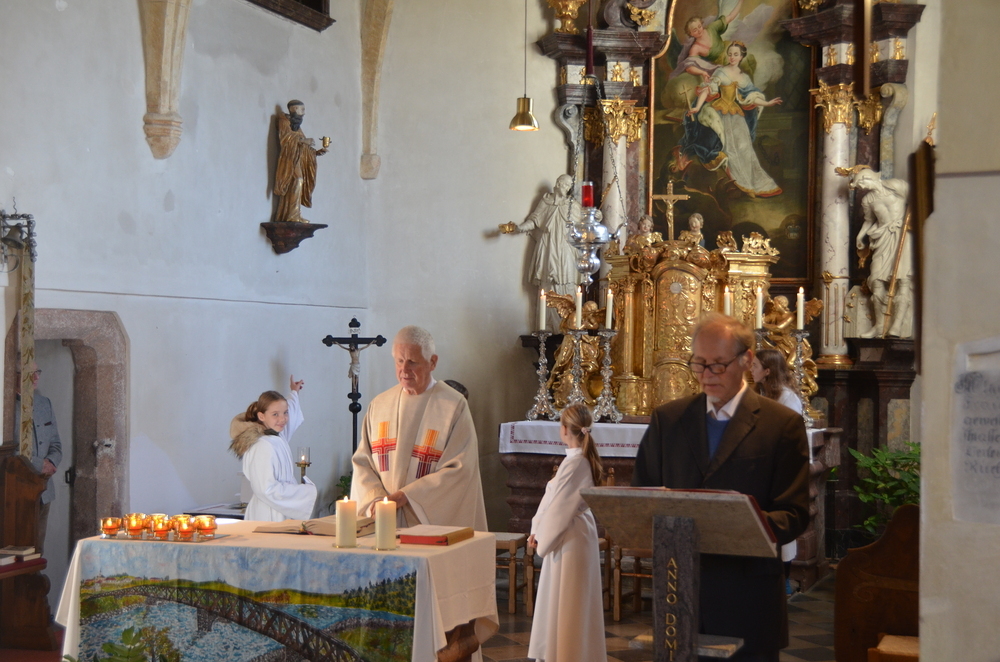 Bei der Allerheiligenlitanei wurden die Heiligen unserer Filialkirche angerufen, wobei die Ministranten auf ihr Bild dabei zeigten.