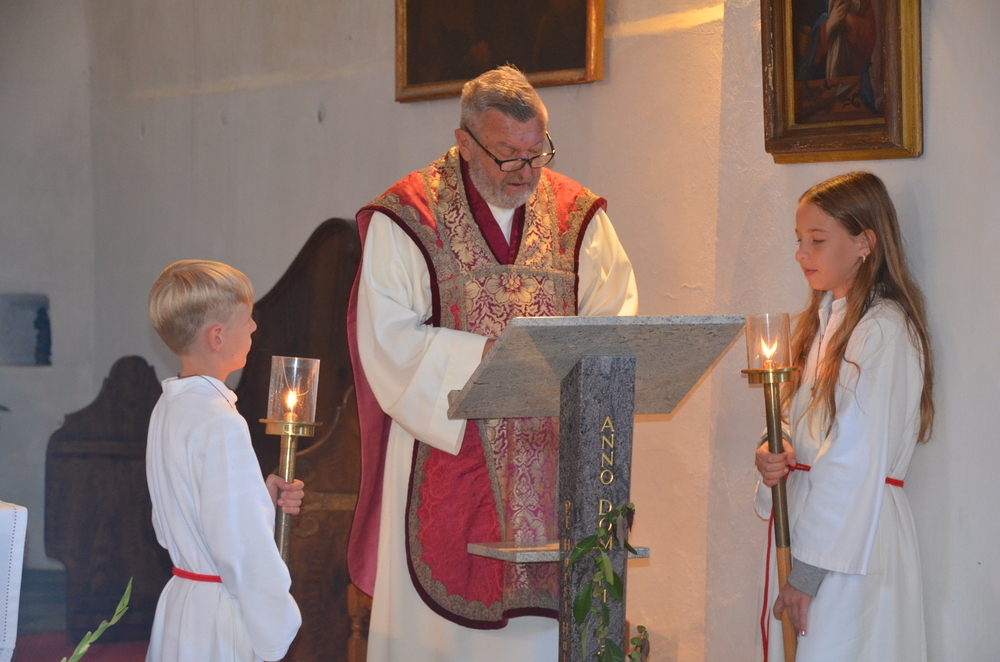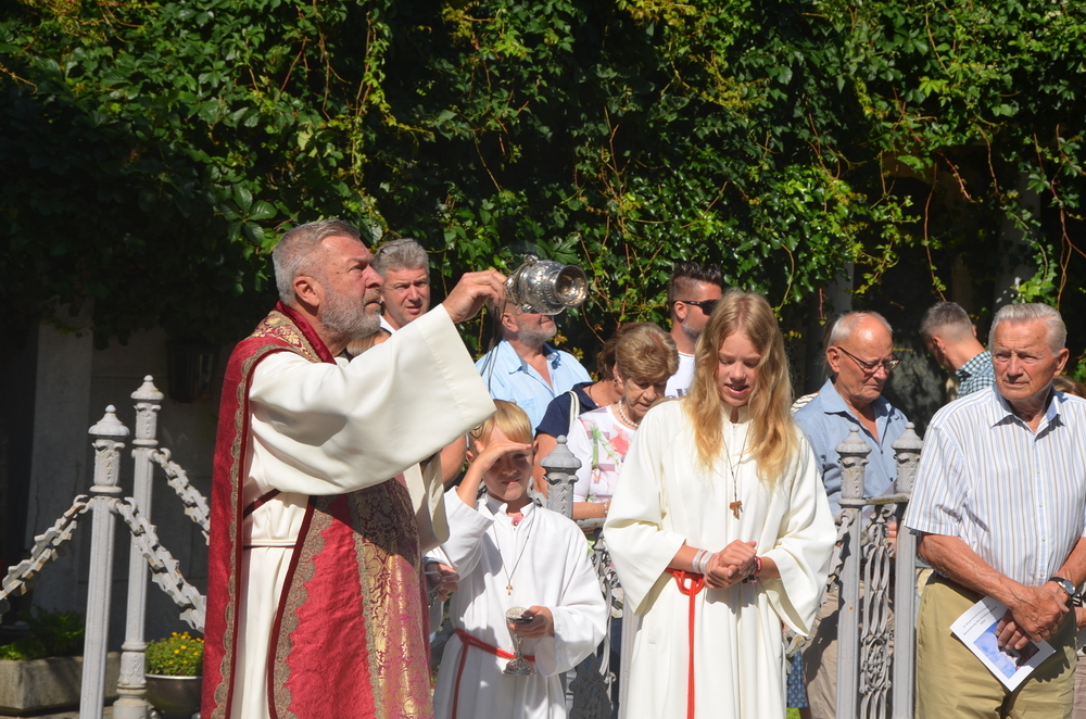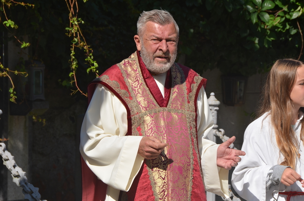 Vor dem Ende der Festmesse segnete der Herr Pfarrer den Kirchturm. Er hatte ein neues Dach und ein vergoldetes Kreuz mit einer Kugel erhalten. - Einfach wunderschön.