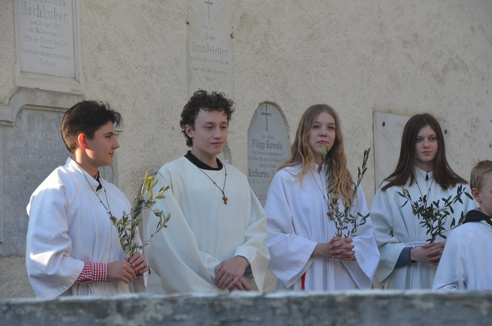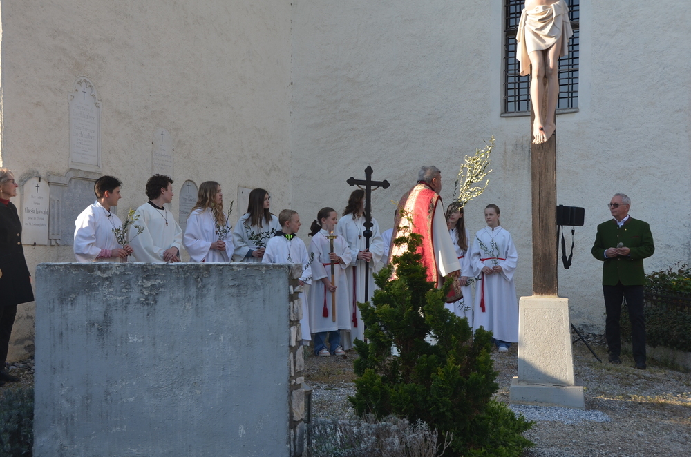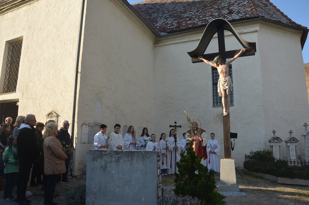 Am Vorabend des Palmsonntags versammelten sich zahlreiche Menschen vor dem Friedhofskreuz in Peggau. Es war ein freudiges Wiedersehen für viele, die sich lange nicht begegnet waren – eine Atmosphäre der Gemeinschaft und Verbundenheit erfüllte den Platz.