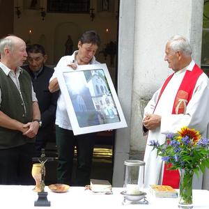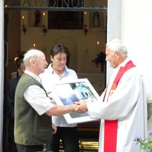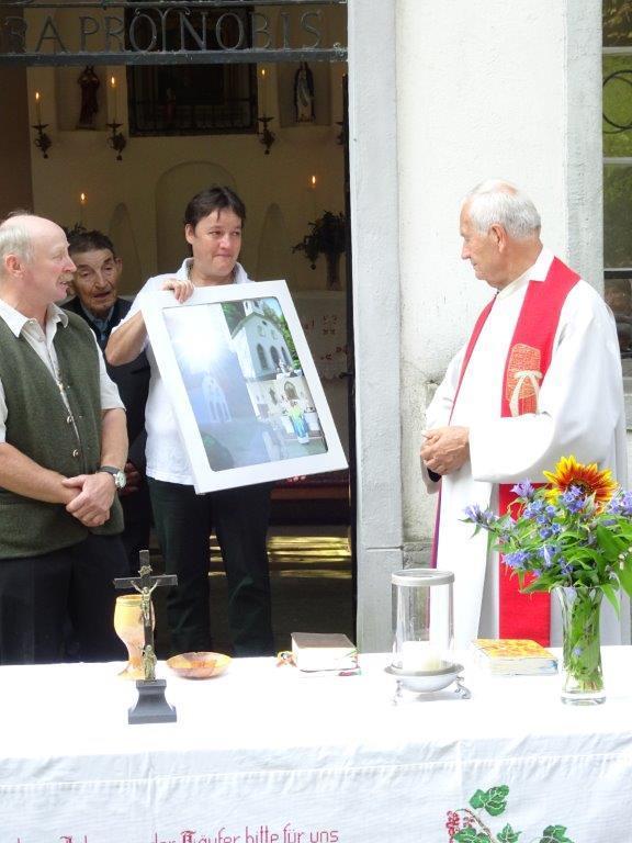Am Festtag des heiligen Bartholomäus, einem der 12 Apostel, zelebrierte Pater Simon am 24. August 2018 um 9.00 Uhr bei herrlichem Wetter die letzte der vier Messe im Jahreskreis bei der festlich geschmückten Kapelle Jordankreuz im Pöllagraben vor 98 Gläubigen. Der Gottesdienst wurde wunderbar vom weiblichen Viergesang der Familie Plienegger vulgo Troll musikalisch umrahmt. Im Anschluss daran wurde von der sorgsamen Kapellenbetreuer-Familie Gabriela & Josef Fuchs vulgo Leeb in der Pölla Pater Simon zum Abschied und Dank ein wunderschönes Bild von der Kapelle zur lieben Erinnerung überreicht.