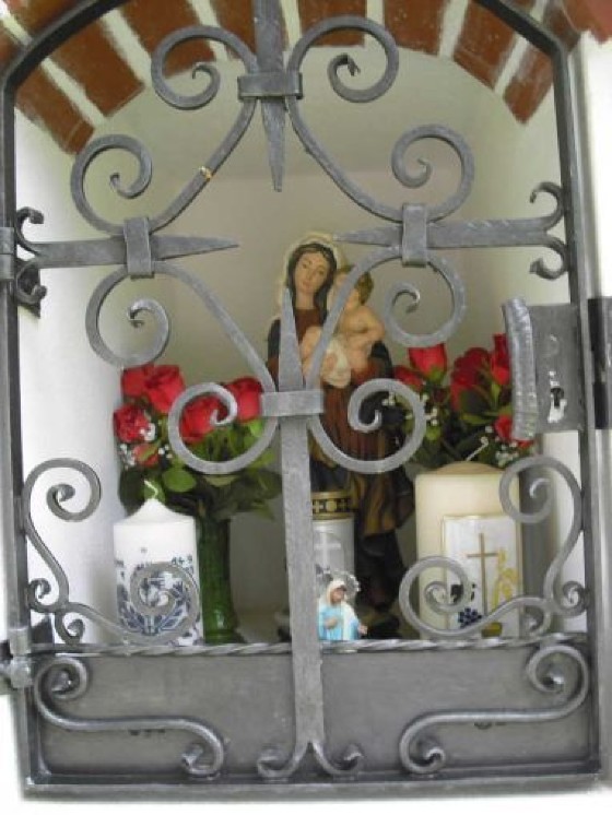 Der errichtete Gedenk-Bildstock fügt sich äußerst schön in das Gehöft nahe der Hofeinfahrt ein. Er steht auf einem Betonsockel, der mit einem Silikatputz versehen ist. Der obere Teil besteht aus einer Ziegelmauer, die vom Bruder Josef, einem gelernten Maurer, errichtet wurde. Der Dachstuhl ist mit Bitumenschindeln gedeckt. In der zentralen Mauernische, deren obere Bogen mit Klinkerziegeln ausgestattet ist, befindet sich eine prachtvolle Statue von der heiligen Maria, die liebevoll das Jesuskind in ihren Händen hält. Außerdem sind dort noch eine Statue, die eine Nachbarin aus Medjugorje mitgebracht hat, und wunderschön verzierte Kerzen. Abgeschlossen ist die Nische mit einem versperrbaren Gitter aus Schmiedeeisen, welches von seinem Freund Alfred Zöhrer vlg. Hoyer kunstvoll angefertigt wurde.