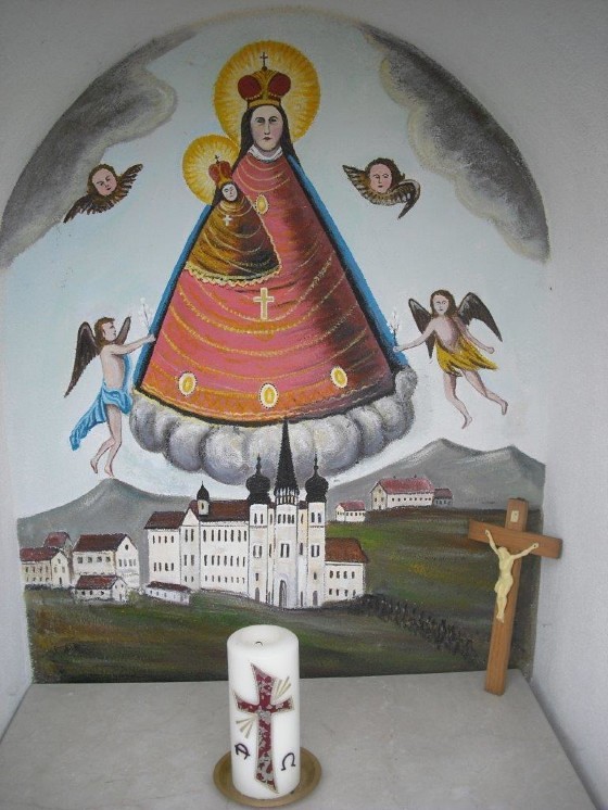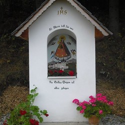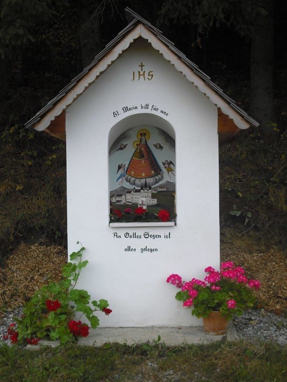 Das Andachtsbild zeigt die gekrönte Mariazeller Madonna mit dem ebenfalls gekrönten Jesuskind auf ihrem rechten Arm, künstlerisch gestaltet vom bekannten Maler Franz Kainz vlg. Tranninger aus der Gams. Als Vorlage verwendete er ein Bild, das der ehemalige Landeskonservator und Nachbar Hofrat DI Dr. Friedrich Bouvier beisteuerte. Die feierliche Einweihung erfolgte am 21. Oktober 2012, demAdriacher Kirchweihfestsonntag, durch den Übelbacher Pfarrer Dr. Horst Hüttl unter großer Anteilnahme von Familie, Verwandten, Nachbarn und Bekannten sowie mit festlicher Hausmusik.