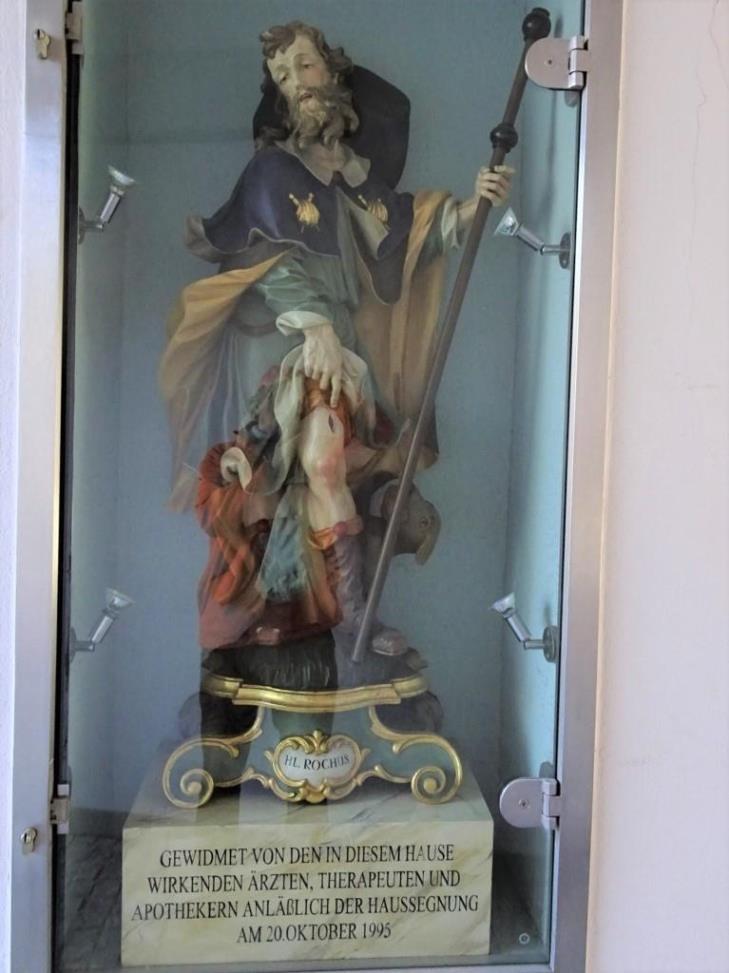 Der Legende nach ist heilige Rochus aus Montpellier (Frankreich) gebürtig. Er lebte dort Anfang des 14. Jahrhunderts, stammte aus einer reichen Familie, doch teilte er sein Vermögen unter den Armen aus und pflegte auf seiner Pilgerreise nach Rom viele Pestkranke aufopferungsvoll. Dabei zeigte sich seine Gabe, Pestkranke allein durch das Zeichen des Kreuzes Christi wundersam zu heilen. Aus diesem Grund ist er Schutzpatron der Kranken, Krankenhäuser, Ärzte, Chirurgen und Apotheker.