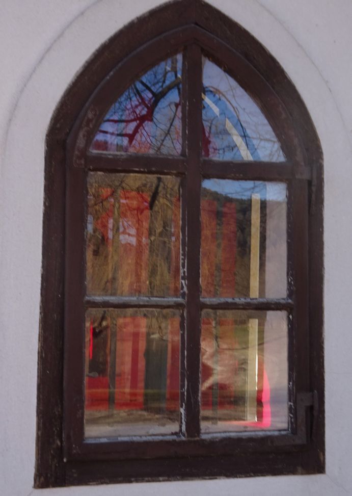 Die Kapelle besitzt seitlich noch zwei spitze Glasfenster aus Holz, die innen mit roten Glasscheiben blickdicht gemacht werden. Das Dach ist mit Tonziegeln gedeckt und mit einem aufgemauerten Dachreiter versehen. Das ist ein auf dem Dachfirst aufsitzender kleiner Turm, der als Glockenträger dient. Abgeschlossen ist der Dachreiter mit einem zwiebelförmigen und stark oxidierten Kupferdach, an dessen Spitze ist ein Eisenkreuz befestigt ist. Umgeben ist die Kapelle ist mit vier uralten, knorrigen Linden.