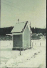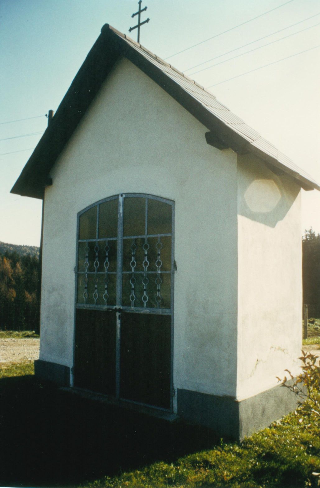 Beschreibung: Die Kapelle hat eine große Doppeltür als Öffnung und keine Fenster. Die Tür ist im oberen Bereich verglast. Auf dem Dach ist ein Doppelkreuz.