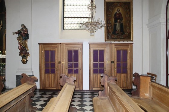 Während (zu Beginn des Gottesdienstes - bis zu den Fürbitten oder solange es notwendig ist) jedes Gottesdienstes sitzt ein Priester in einem der Beichtstühle, die im hinteren Bereich der Kirche sich befinden.