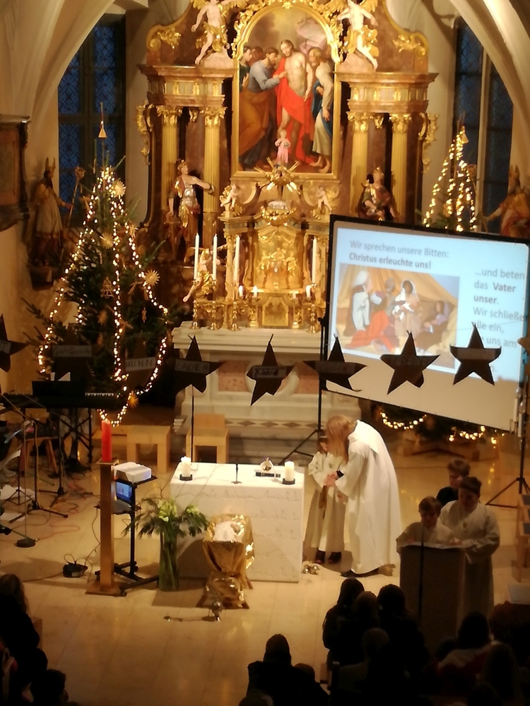 Die Christmette, dieses Mal eine Wort-Gottes-Feier mit Kommunionspendung, feierte Diakon Wolfgang Garber mit uns. In seiner Predigt lud er uns ein, es Weihnachten werden zu lassen, indem wir uns „in die Krippe unseres Nächsten“ legen, d.h. achtsam und einfühlsam mit unseren Mitmenschen umgehen, sodass „Menschwerdung“ erfahrbar wird. Stimmungsvolle Weihnachtslieder erfüllten die abendliche Kirche und die Herzen.