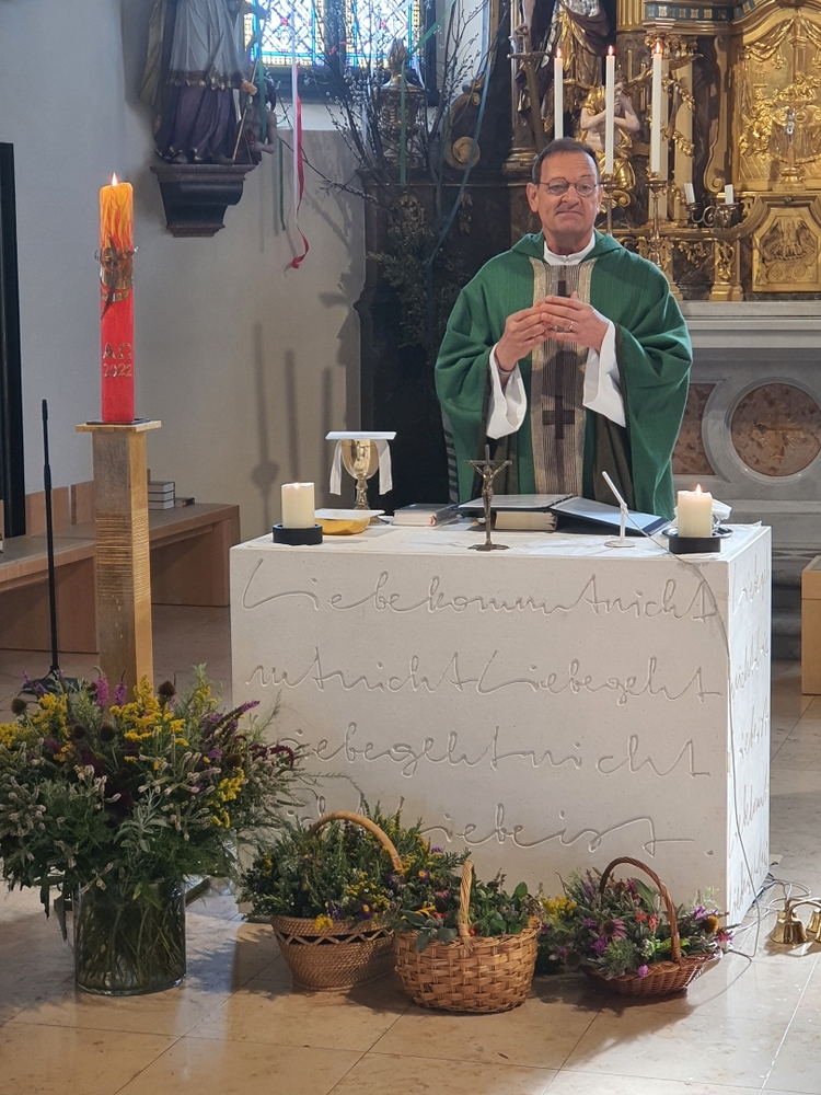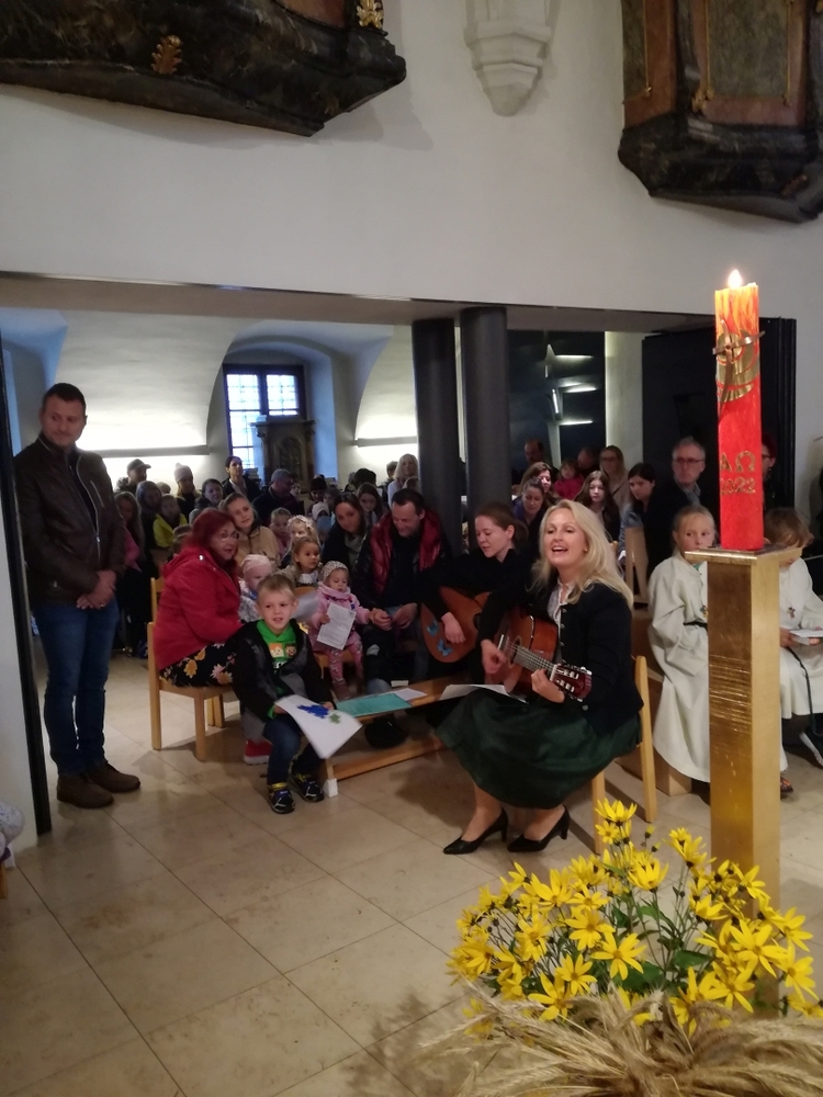 Mit dem Begrüßungssatz „Heute gießt der liebe Gott die Blumen!“, zauberte Vikar Gerhard Hatzmann – in Anspielung auf das Regenwetter – allen großen und kleinen Menschen in unserer Pfarrkirche ganz schnell ein Lächeln ins Gesicht. Eine wunderbare, fröhliche Erntedankfeier folgte.