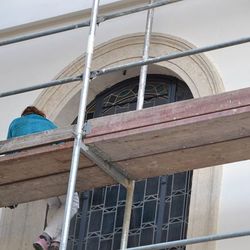 Gleichzeitig arbeiteten die Steinrestauratoren an den Fenster- und Türumrandungen und dem Sockel.
