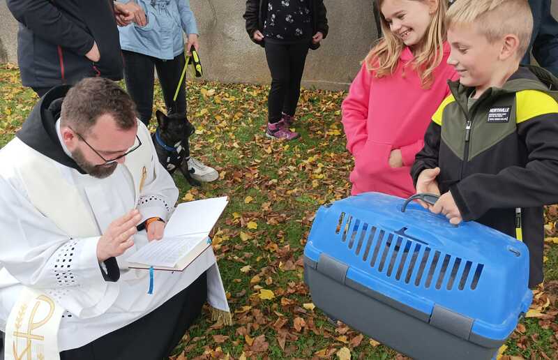Im Religionsunterricht bei Frau Manuela Andrä kamen die Kinder auf die Idee, dass ihre Haustiere auch gesegnet werden sollen. Schnell wurde von Manuela ein kleiner Chor organisiert und am 1. Oktober trafen wir uns um 15:00 Uhr vor der Kirche. Egal ob das Tier dabei war, ein Kuscheltier oder das Foto eines Tieres, P. Ulrich ist zu jedem gegangen und hat das Tier gesegnet. Danke den Sängerinnen Manuela, Marie, Johanna und  Lea. Zum Lobe Gottes. Amen